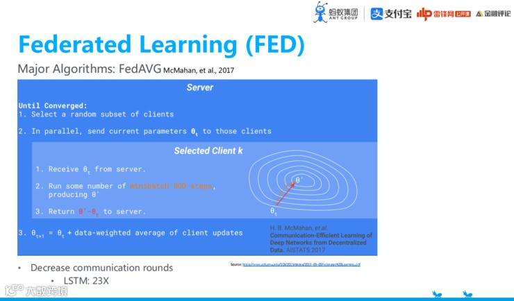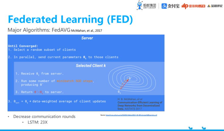 在2016-2017年,联邦学习有相应论文发表。目前用的算法也是从服务器上拉了一个模型,做完更新,delta发给服务器做average并更新模型。