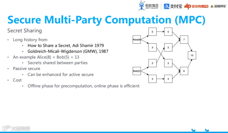 这里面有几个典型技术,一是秘密分享(Secret Sharing),密码学里一个比较老的技术。早在七八十年代就已经有相应的论文发表。