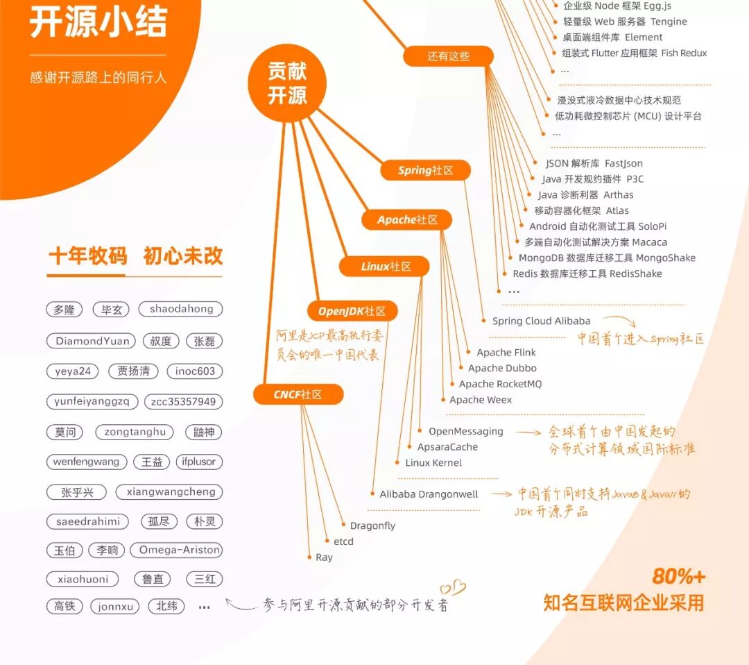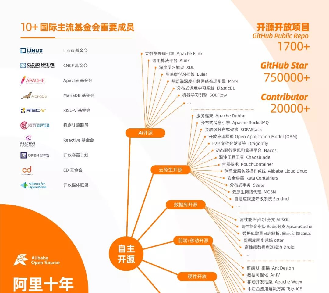 过去的10年里,阿里也是与社区合作最为紧密的中国公司之一,受邀成为十多个国内外开源基金会成员,积极贡献开源:不仅是 Java 全球管理组织 JCP 最高执行委员会的唯一中国代表,也是 Linux、RISC-V、Hyperledger、MariaDB、OCI 等多个基金会的重要成员。至今有四个顶级项目捐赠至 Apache,超10个项目进入 CNCF Landscape。
