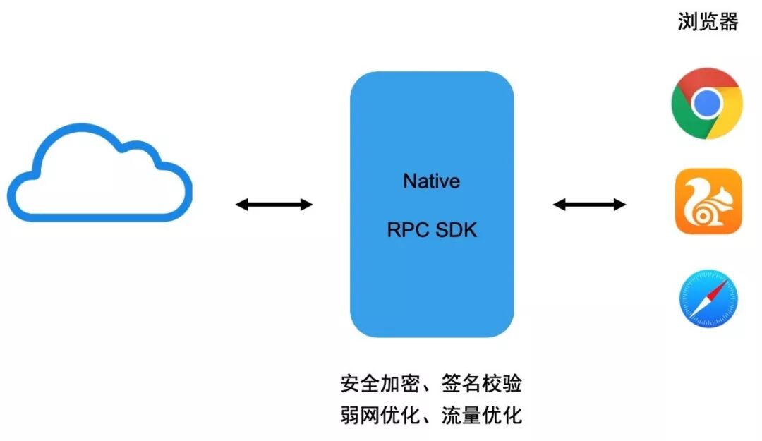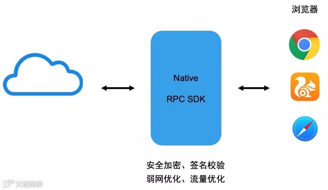 H5 容器提供的 JSBridge 解决了这个问题,所有 H5 页面需要从后台获取的数据都通过 JS Bridge 调用 Native 的 RPC SDK 来获取。这样实际 App 请求的数据都是由 RPC SDK 来发送,从而可以实现安全加密、签名校验、弱网优化、流量优化的功能。Native 层的这些功能是 Web 页面开发人员无感知的,所以业务开发人员只需要专注其自身的业务开发即可。安全性由支付宝底层 SDK 保障。