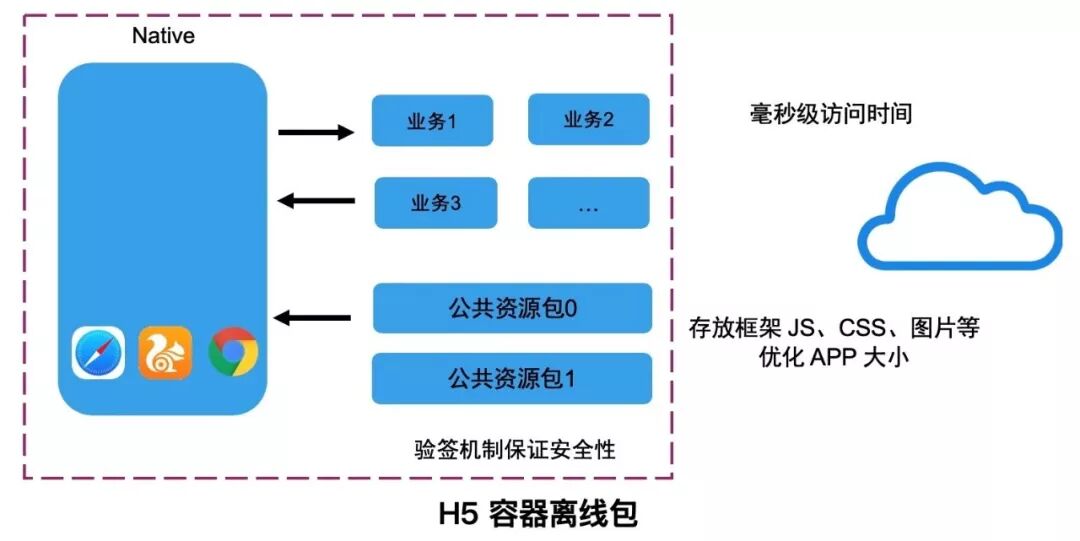 为了优化 H5 容器用户体验,减少白屏时间,支付宝在 H5 容器中引入了离线包技术。离线包可以简单理解为一个 zip 压缩包,其中包含前端页面所需的 HTML、CSS、JS、图片等资源。内置到客户端后,H5 容器打开离线包页面时会直接从离线包中获取资源,这个是毫秒的访问时间,消除了打开页面白屏现象。