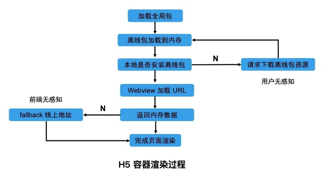 结合前面说到的离线包后,整个 H5 容器渲染流程如下。其中离线包资源的更新、下载对用户无感知,页面访问的资源是来自离线包还是来自 fallback 地址对前端是无感知的。