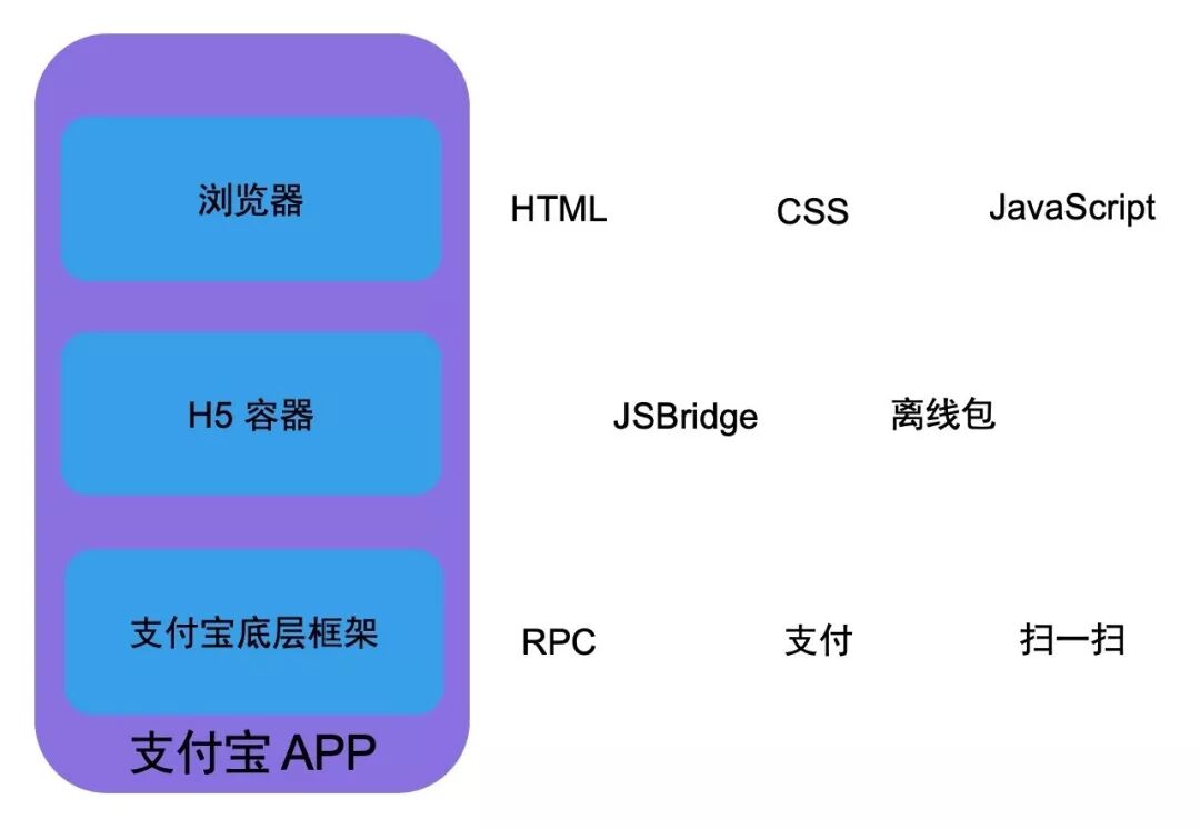 最上层是浏览器,这块就是大家常见的 Web 开发环境,包括HTML、CSS、JavaScript等。H5 容器作为中间层,将浏览器和支付宝底层框架有机结合起来,在 H5 容器里面有 2 个非常重要的概念:JSBridge 和 离线包,后面会做详细介绍。支付宝底层框架会给 H5 容器提供 Native 的能力,这其中就包括 RPC(远程过程调用,用来实现 APP 和服务器通信)、支付、扫一扫等。