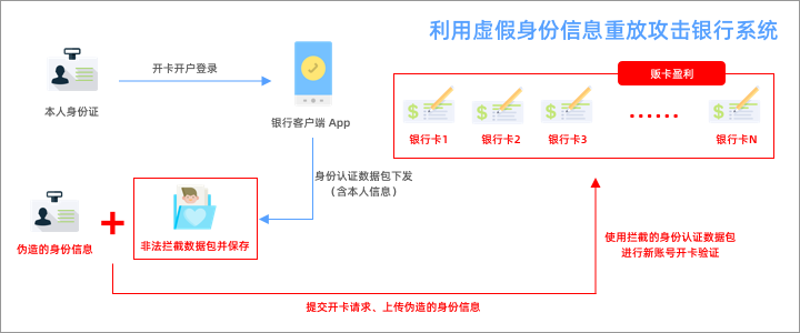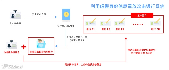首先,田某通过本人身份证信息,在注册账号正常流程中,通过「软件抓包」技术将银行系统下发的人脸识别身份认证数据包进行拦截并保存。 -