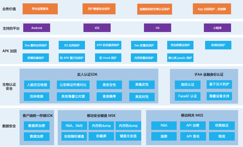 作为源自支付宝的移动开发平台,mPaaS 目前已完成支付宝金融级的端上安全能力沉淀,不仅能够提升 App 应对高峰带宽下的服务质量挑战,同时在弱网情况下的可用性、针对网络请求的危险识别能力均属于行业前列。目前,借助 mPaaS 客户端的加固技术与黑匣子,能够保障移动端的代码安全和网络层的数据安全,提供加签、加密等方式,同时网关能够识别出客户端环境,并有能力针对可疑请求做拦截。
