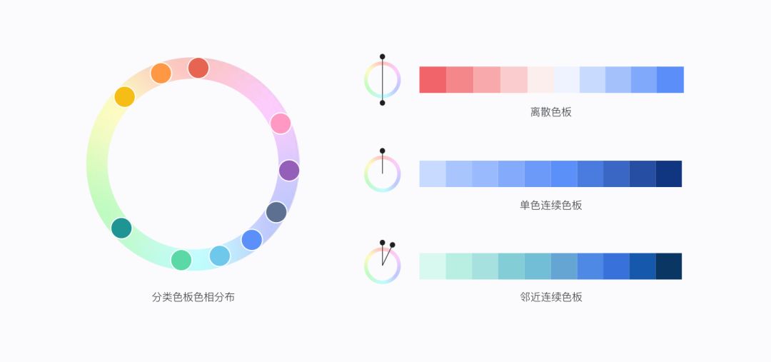 基于 Ant Design 「确定性」「意义感」「增长性」「自然」的价值观,遵循 AntV 「准确」「清晰」「有效」「美」延展出适应深浅版地图的炫彩通用色板。基于 AntV 体系的基础分类色板配图,L7 延展出离散色板、连续色板、单色连续色板、邻近连续色板。