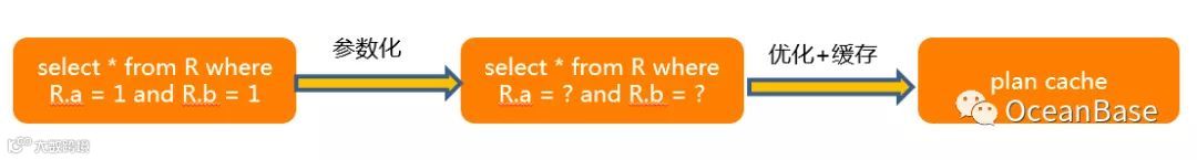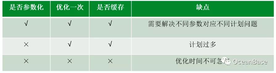 如下图所示,OceanBase 目前使用参数化计划缓存的方式。这里涉及到两个问题:为什么选择参数化以及为什么选择缓存?