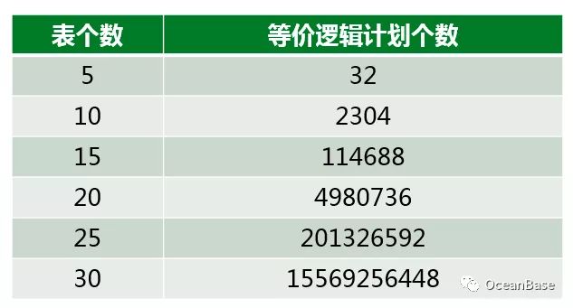 复杂查询的计划空间是非常大的,在很多场景下,优化器甚至没办法枚举出所有等价的执行计划。下图展示了星型查询等价逻辑计划个数(不包含笛卡尔乘积的逻辑计划),而优化器真正的计划空间还得正交上算子物理实现,基于代价的改写和分布式计划优化。在如此海量的计划空间中,如何高效的枚举执行计划一直是查询优化器的难点。
