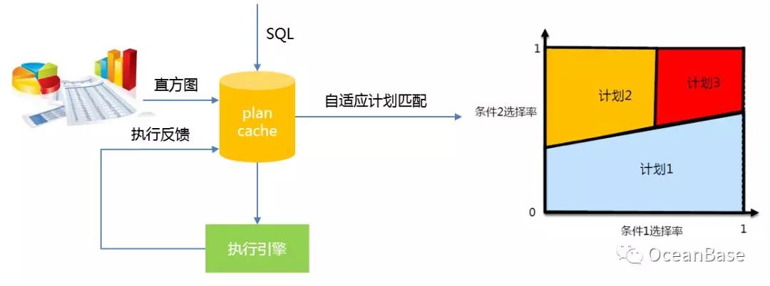 为了解决不同参数对应不同计划的问题,OceanBase 实现了如下图所示的自适应计划匹配。该方法会通过直方图和执行反馈来监控每一个缓存的计划是否存在不同参数需要对应不同计划的问题。一旦存在,自适应计划匹配会通过渐进式的合并选择率空间来达到把整个选择率空间划分成若干个计划空间(每个空间对应一个计划)的目的。