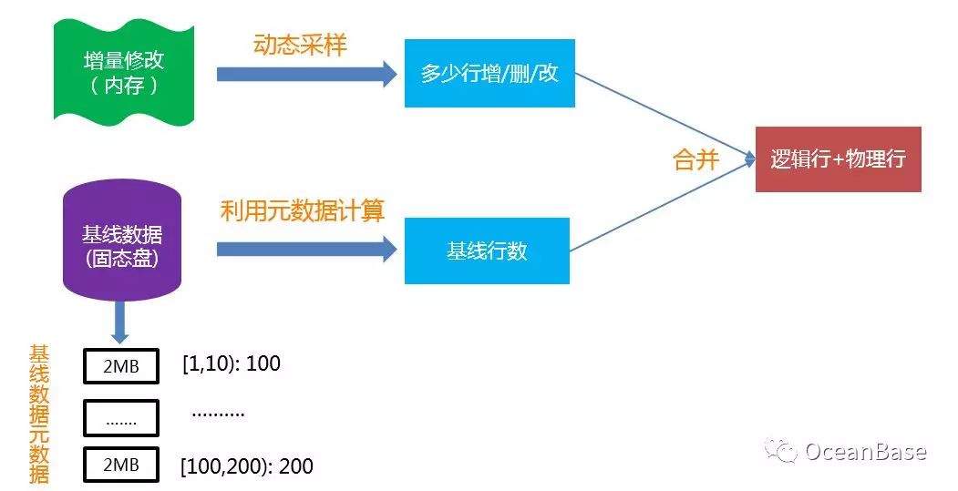 再考虑上图中的例子,在该图中,逻辑行是 0 行,而物理行是 20w 行。给定索引扫描的开始/结束位置,对于基线数据,因为 OceanBase 为基线数据维护了块级别的统计信息,所以能很快的计算出来基线行数。对于增量数据,则通过动态采样方法获取增/删/改行数,最终两者合并就可以得到逻辑行和物理行。下图展示了 OceanBase 计算逻辑行和物理行的方法。
