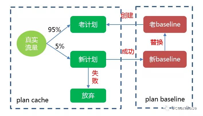 在蚂蚁/阿里很多高并发,低时延的业务场景下,OceanBase 必须要保证新生成的计划不会导致性能回退。下图展示了 OceanBase 对新计划的演进过程。不同于传统的数据库系统采用定时任务和后台进程演进的方式,OceanBase 会使用真实的流量来进行演进,这样的一个好处是可以及时的更新比较优的计划。比如当业务新建了一个更优的索引时,传统数据库系统并不能立刻使用该索引,需要在演进定时任务启动后才能演进验证使用,而 OceanBase 可以及时的使用该计划。