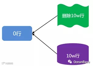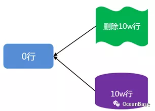 考虑下图中 LSM-TREE 存储引擎基线数据被删除的一个例子。在该图中,基线中有 10w 行数据,增量数据中维护了对这 10w 行数据的删除操作。在这种场景下,这张表的总行数是 0 行,在传统的基于 Buffer-Pool 的存储引擎上,扫描会很快,也就是说行数和代价是匹配的。但是在 LSM-TREE 存储引擎中,扫描会很慢(10w 基线数据 + 10w 增加数据的合并),也就是行数和代价是不匹配的。