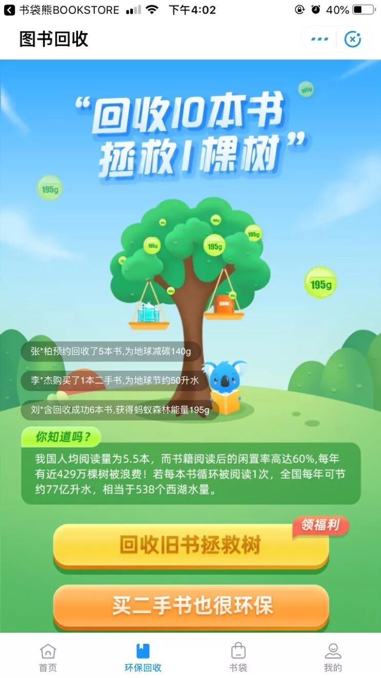 基于回收能力形成的壁垒,现在,在芝麻信用的信用回收频道,以及在城市服务领域,书袋熊都成为图书快速回收场景的服务者,输出图书回收处理能力。同时,书袋熊也作为绿色能量生产的策略和支付宝生态紧密结合,读者参与书籍回收可以获得相应的“蚂蚁森林能量”奖励。