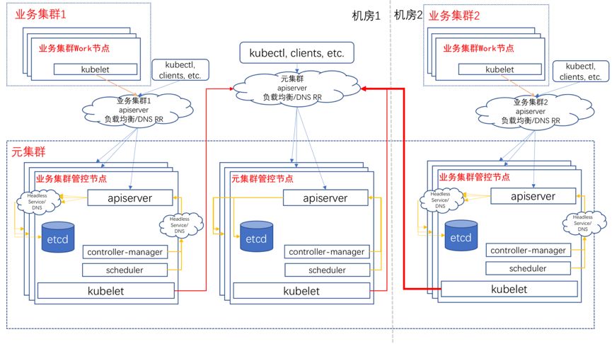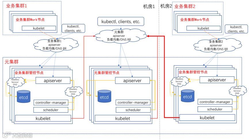 为此,开发团队设计出了 Kube-on-Kube-Operator,它的用途是将各个机房交付给用户的 Kubernetes 集群(称为 “业务集群”) 的组件和服务也都跑在一个 Kubernetes (称为 “元集群”) 上。下图是Kube-on-Kube-Operator的核心架构图: