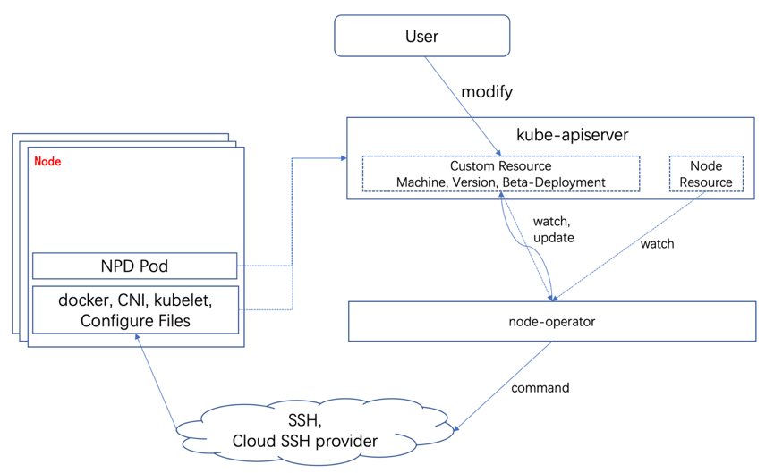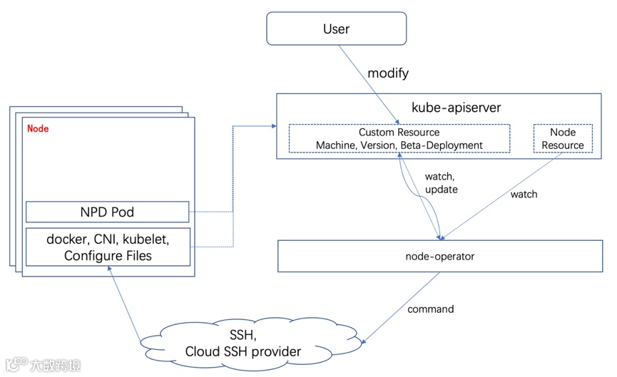 Node-Operator 正是在这样的背景下诞生的,其使用声明式编程、面向终态的特性去管理 Worker节点。Node-Operator 的职责涵盖从云厂商购买计算节点开始到接管 Kubenertes 节点整个生命周期:从初始化证书、kubelet 以及节点必要组件,到自动化升级组件版本,再到最后的节点下线。同时,Node-Opeator 也会订阅 NPD(Node Problem Detector) 上报的节点故障信息,进行一系列自动化修复。下图是 Node-Operator 的核心架构图: