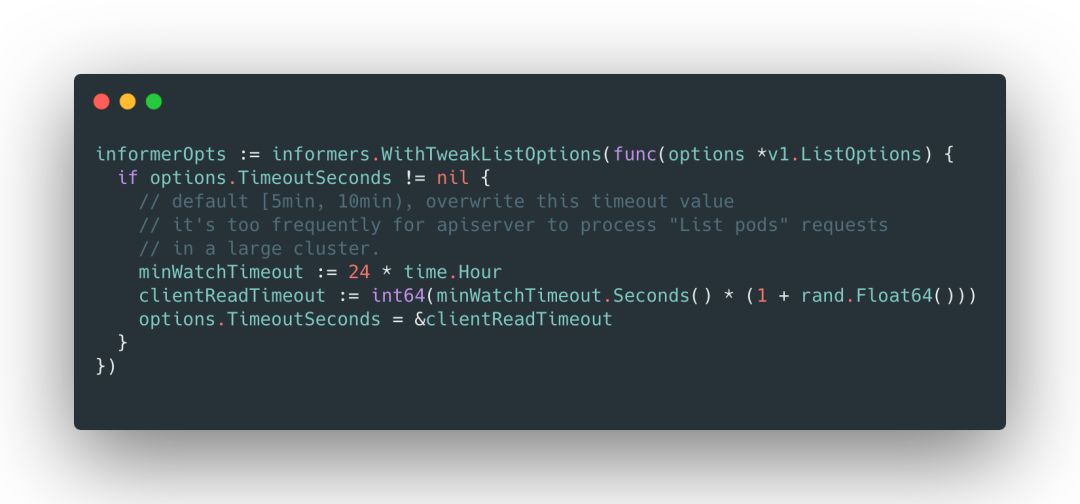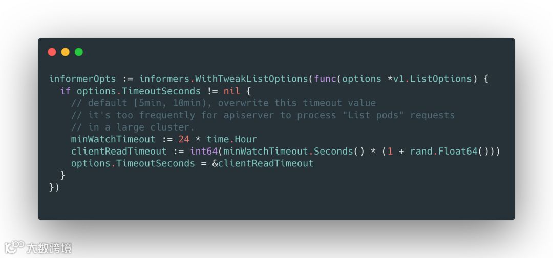 在后续越来越多的系统 Daemonset 上线之后,团队发现,即使做到了所有客户端使用 Informer,集群内的 List Pod 请求依旧很多。这主要是 Kubelet 和 Daemonset 带来的,可以用 Bookmark 特性来解决这个问题,在未上线 Bookmark 的集群内,可以调整 API Server 对资源的更新事件缓存量来缓解该问题 (如--watch-cache-sizes=node#1000,pod#5000),同时调整 Daemonset Re-Watch 的时间间隔: