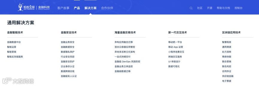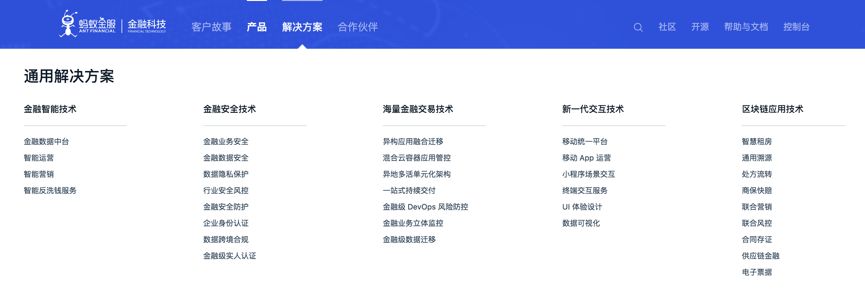 我们知道,2015年以来,蚂蚁金服陆续开放了包括分布式中间件、分布式数据库、区块链、生物识别在内的自主研发核心技术。到了2018年,蚂蚁金融云正式升级为蚂蚁科技开放平台。根据蚂蚁科技官网显示,目前蚂蚁对外开放的产品有80多个,而数字金融解决方案各有50余款。这些核心产品与方案都来自蚂蚁自身的实践。