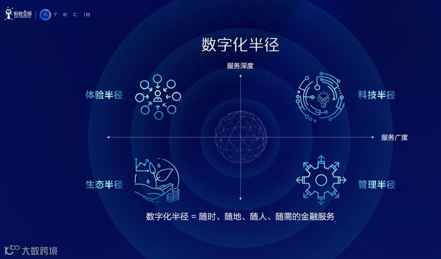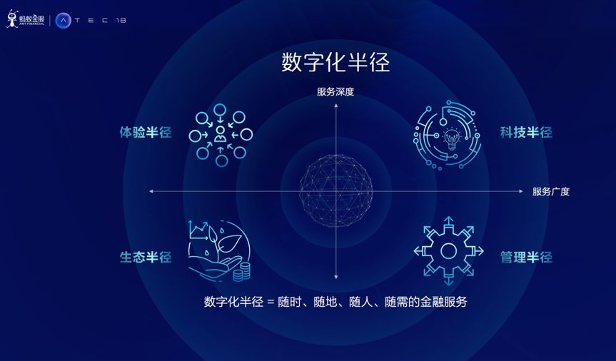 “科技半径”决定了对业务响应敏捷能力对创新业务的掌控能力。从具有金融级别支撑能力的分布式计算平台等底层技术,到大数据、人工智能、等为代表的金融智能技术,到以智能风控、生物核身等金融级安全技术,再到区块链等创新科技,科技半径的完整性和整合能力代表了面向未来的核心驱动力。