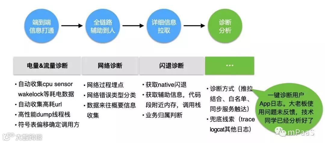 参考这张图,我们能够清晰地了解支付宝内部是如何进行问题诊断与定位:从“端到端的信息打通”到“全链路辅助到人”,“详细信息拉取”后在进行相应的“诊断分析”,同时会配备具体的诊断策略。