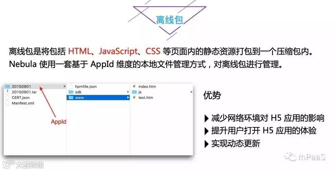 离线包是将 HTML、JavaScript、CSS 等页面内的静态资源打包到一个压缩包内,Nebula 使用一套基于 AppId 维度的本地文件管理方式,对离线包进行管理。这和前面提到的框架「积木的概念」如出一辙,每一个离线包都是一个小积木,这个小积木可以很方便的做到热插拔,实现动态更新。