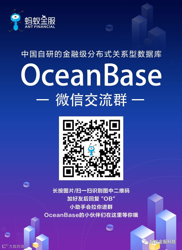 扫描下方二维码联系蚂蚁金服加群小助手,回复关键词“OB”,即可快速加入OceanBase数据库技术交流群,来和蚂蚁金服一线OceanBase技术人员还有其他小伙伴们一起讨论交流~!