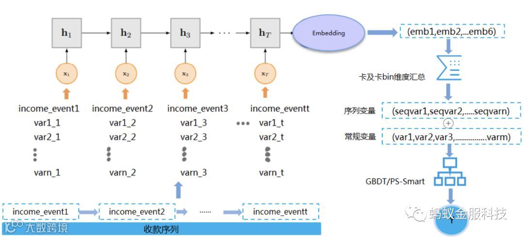 如前面已提到转账到卡场景欺诈的防控难点在于新卡的防控。根据历史经验群体变量及FTG变量对于新卡有一定的防控效果,目前在转账到卡场景已刻画城市、年龄及卡bin等维度的FTG变量。为了进一步防控新卡风险,我们从群体及FTG变量的思路出发,利用深度学习序列建模生成卡维度的embedding,然后将卡维度的embedding再汇总到卡bin维度,汇总的embedding提炼了该卡bin的行为信息,从而对于新卡来说只要其卡bin出现过就可以获取其卡bin行为特征。最后将生成的embedding变量与现有变量合并建模,输出整体欺诈风险分值,具体流程图如下: