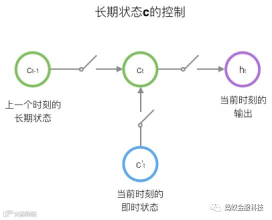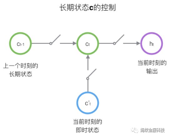 RNN的隐藏层只有一个状态h,它对于短期的输入非常敏感,LSTM中增加一个状态c (cell state)来保存长期的状态。LSTM中使用三个控制开关控制长期状态c,第一个开关负责控制继续保存长期状态c,第二个开关负责控制把即时状态输入到长期状态c,第三个开关负责控制是否把长期状态c作为当前的LSTM的输出。三个开关的作用如下图所示: