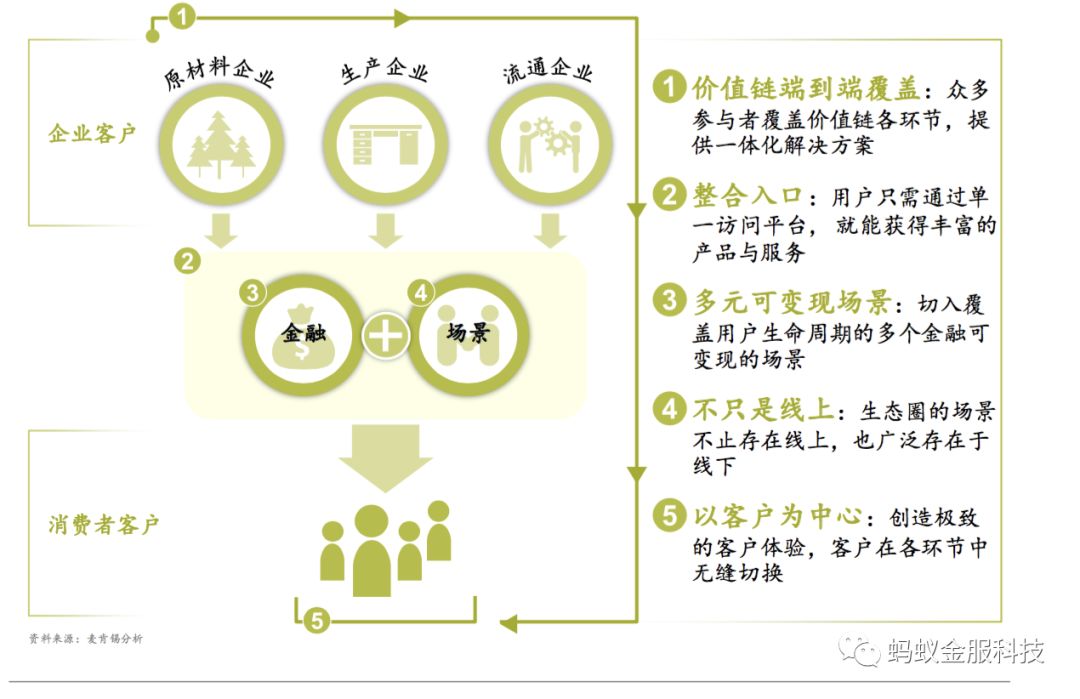 根据麦肯锡报告,生态圈是行业价值链各环节参与者聚合成的广泛、动态的联盟。对于银行而言,生态圈的精髓是通过“金融+场景”的方式服务客户端到端的金融相关需求。银行从客户潜在痛点出发,挖掘一系列解决客户痛点的场景和机会点,从而将金融产品全方位、无缝插入客户旅程端到端的相关场景中,满足客户全方位的需求。与传统的业务合作相比,它主要有5大特点: