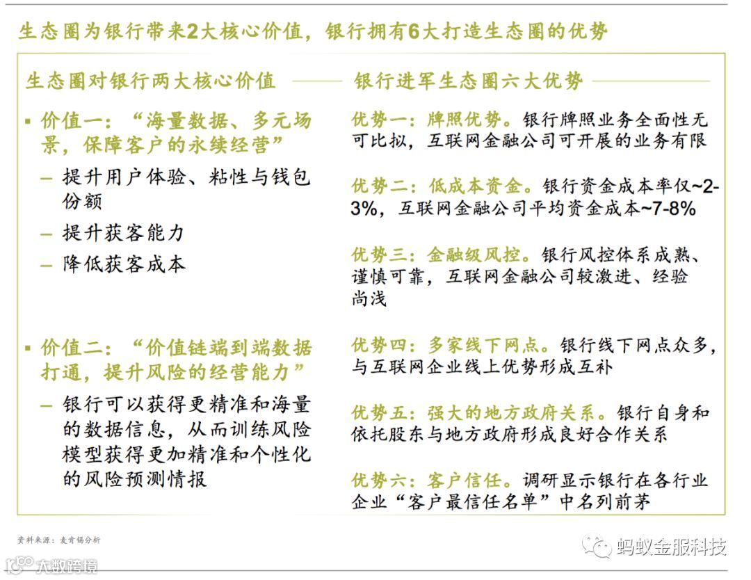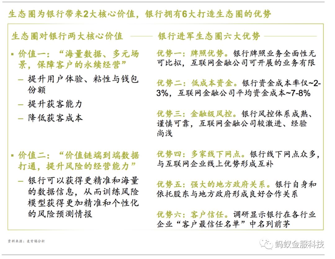 所以,对于最重要的问题——生态圈战略为什么可以帮助银行破局?结合银行打造生态圈战略的优势调研,报告分析称,生态圈战略能够帮助银行提升经营客户和经营风险这两大核心能力,改善银行经营的基本面;此外,由于互联网企业在资本市场估值普遍较高、银行业估值普遍较低,银行向生态圈战略进军也能提振资本市场对其的估值。