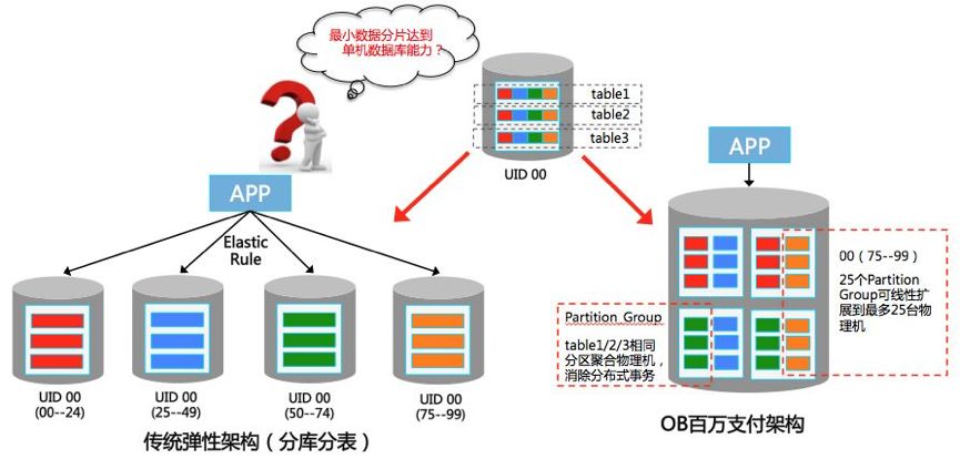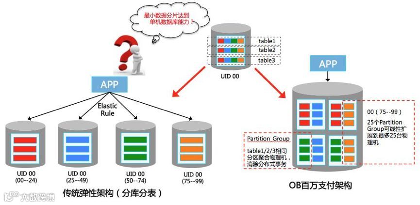 OceanBase 2.0应运而生,其目标是在应用无感知的情况下对数据分片进一步拆分,将数据sharding到无限多的机器上,实现极致弹性能力优雅支撑百万支付峰值。