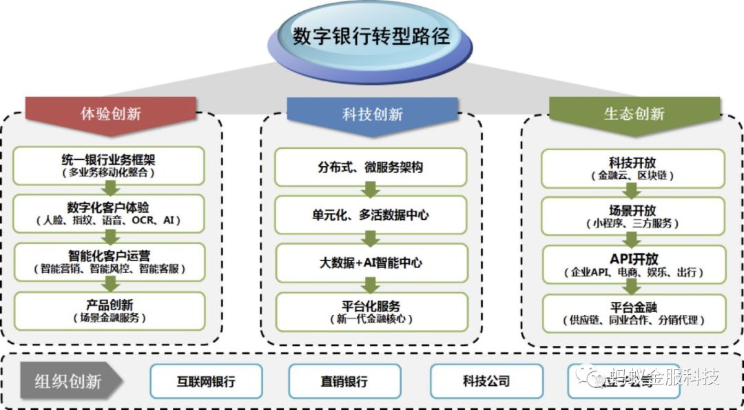 结合蚂蚁金服与金融机构合作过程中的探索和实践,以及不同银行机构的技术现状和业务实际特点,刘伟光总结了国内银行数字化转型的四个切入点,包括体验创新、科技创新、生态创新和组织创新:
