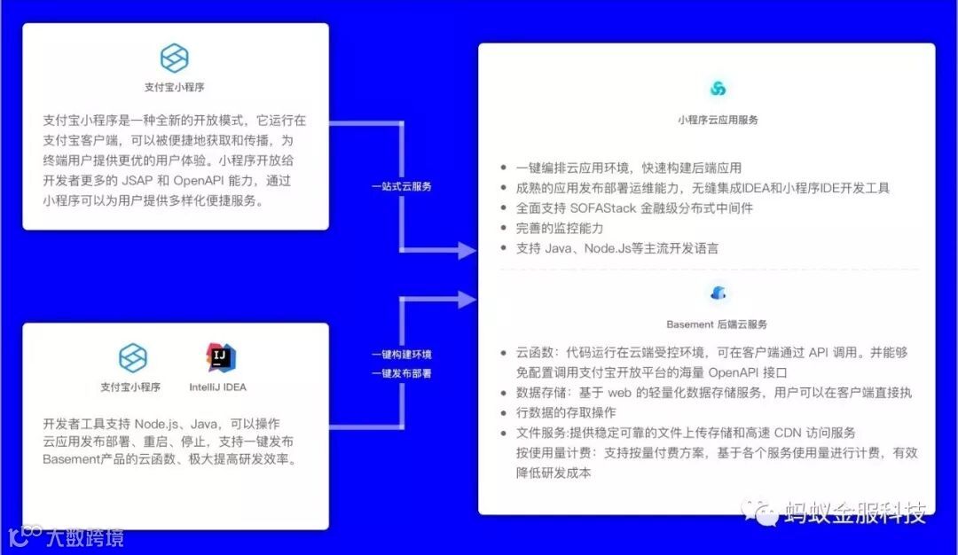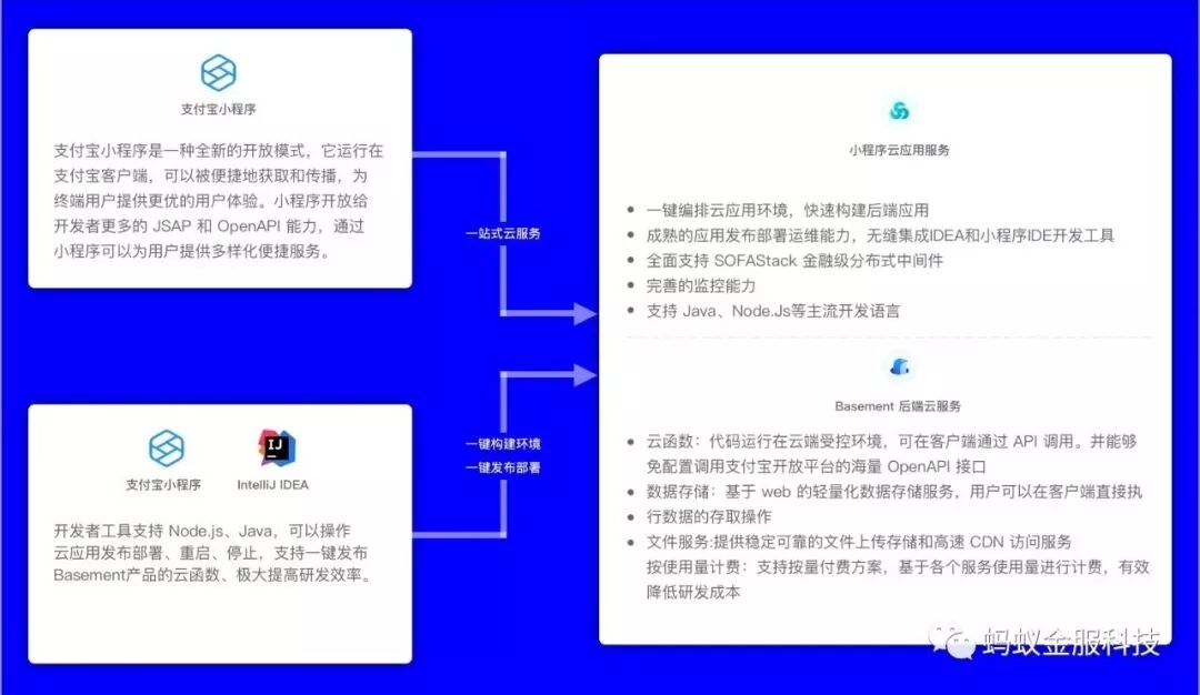 针对小程序开发者的不同场景和诉求,蚂蚁金融科技提供了小程序云应用服务和Basement后端云服务两个产品。