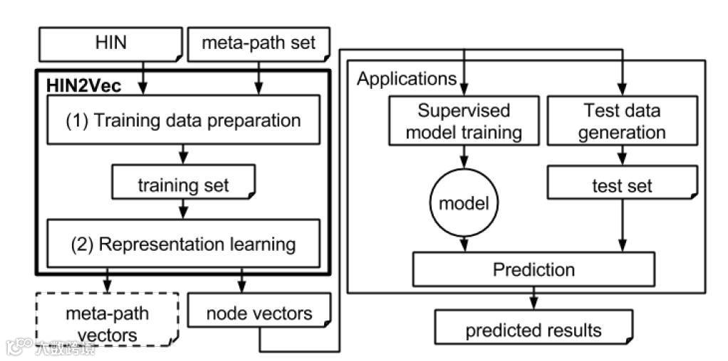 解读:提出异构网络中,如何融合网络结构和不同关系(meta-path)信息框架,得到节点的embedding,核心创新点:通过将边的信息转化成meta-path,整个模型目标是预测meta-path,从而达到融合异构网络边类型信息的效果。整个方案框架分2个步骤: