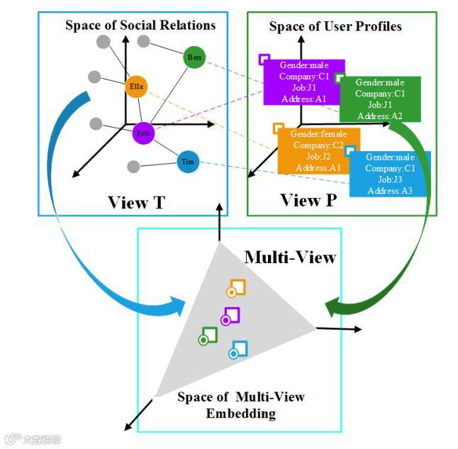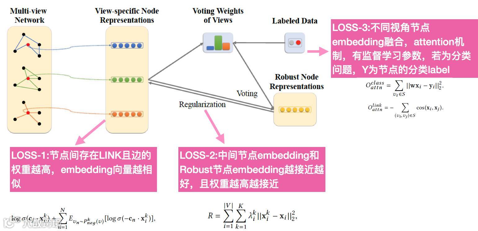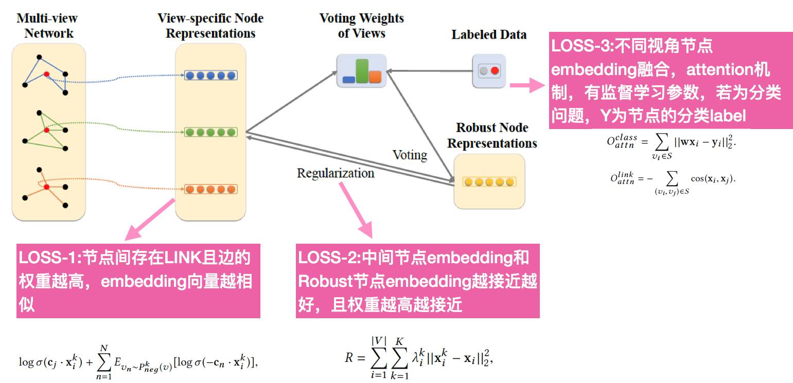 解读:区分网络多种构成方式,比如:社交关联、资金转账网、属性相似性网等,从不同的视角分别做节点embedding,再基于Attention机制融合不同的embedding结果。整体框架如下图: