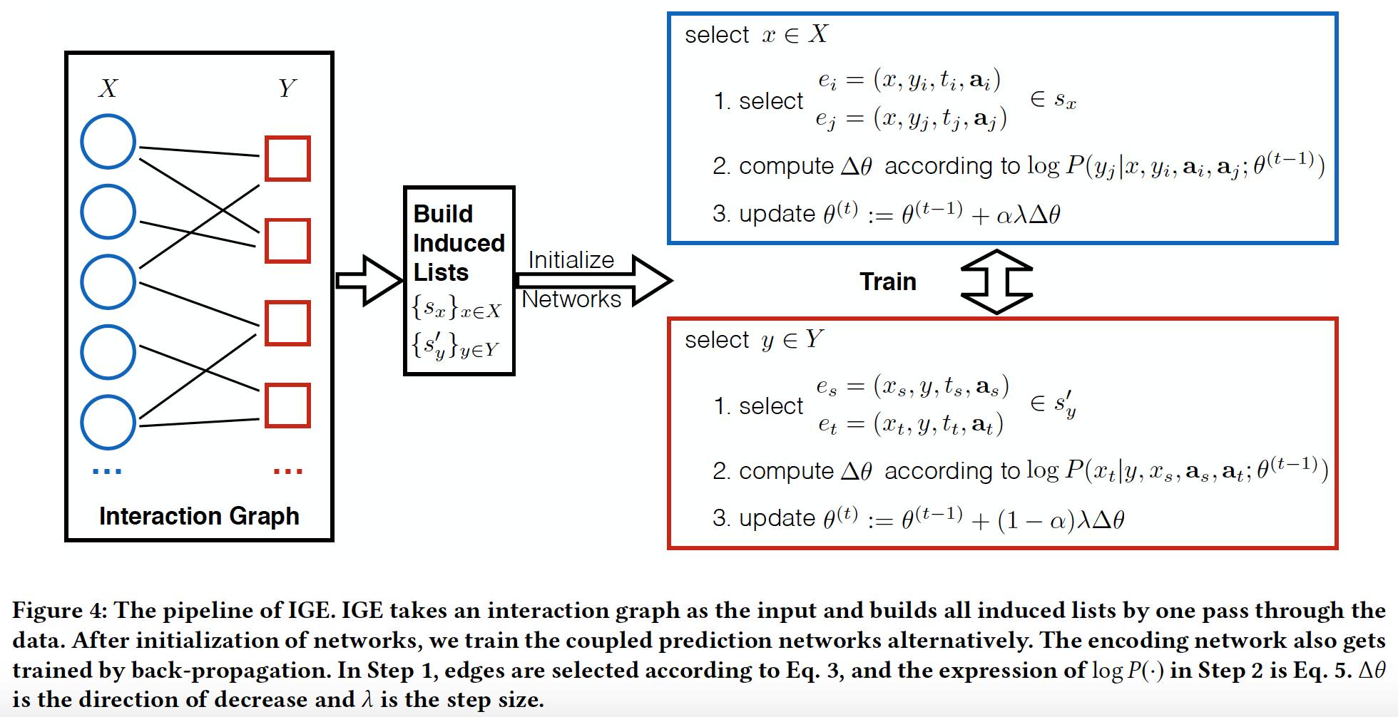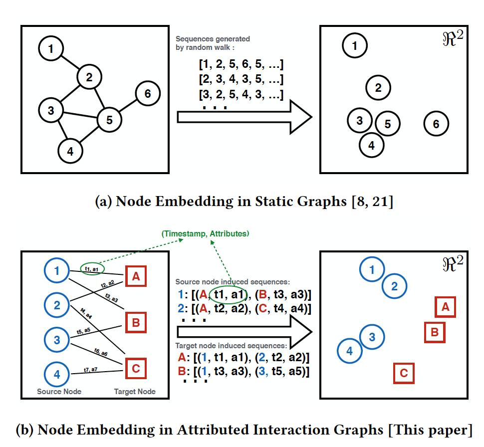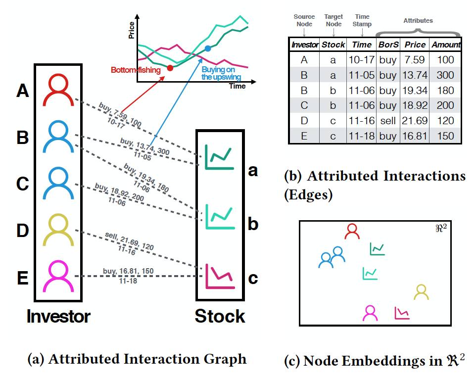 解读:网络构成中,边上带了很丰富的交互信息,如何同时利用这部分信息进行节点Embedding。比如“用户”-“股票“之间的交易网络,边上带有丰富的“时间、价格、数量”特征,如何结合这些信息和网络结构,得到“用户”、“股票”的embedding向量,进而用于预测“用户”后续会买哪只股票。