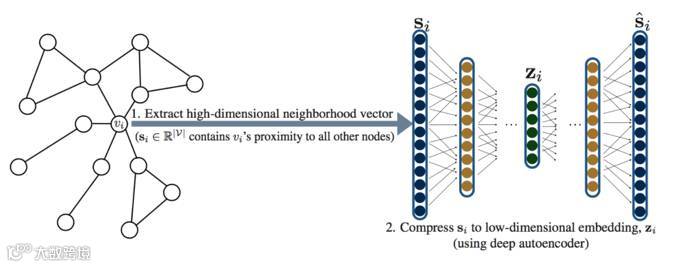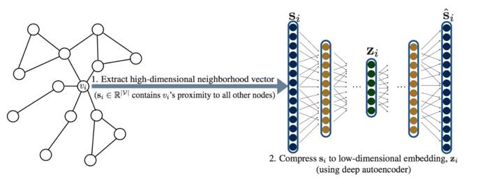 主要思想:将节点的相似性向量 s~i~直接作为模型的输入,通过 Auto-encoder 对这个向量进行降维压缩,得到其向量化后的结果 z~i~。