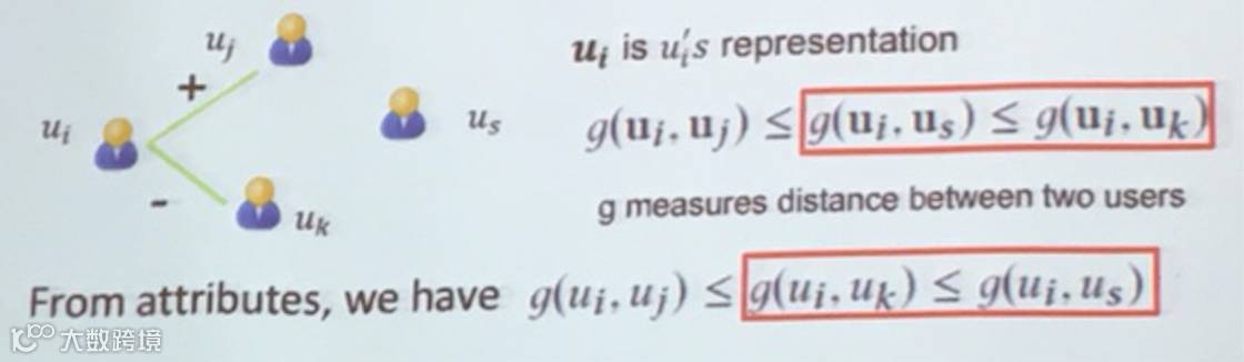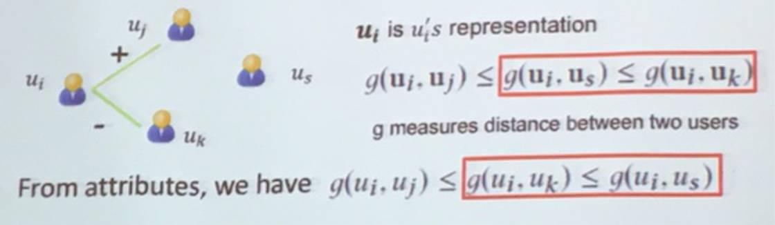 解读:融合节点属性的signed(边有Positive&Negative)网络的embedding,例如:社交网络,用户有基本属性,Positive关系有关注、点赞等,Negative关系有取消关注、不支持等。论文中的核心假设:1)从网络结构角度,“有Positive-Link节点间距离” < “无直接Link节点间距离” < “有negative-Link节点间距离”;2)从属性相似性角度,“有Positive-Link节点间距离” < “有negative-Link节点间距离” < “无直接Link节点间距离” 。如下图: