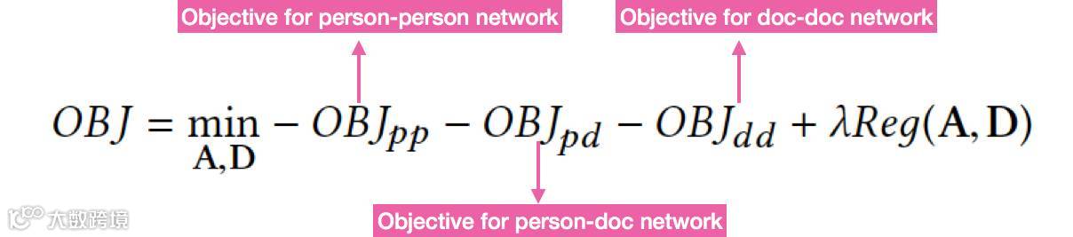 基本假设:存在LINK的节点间Embedding距离 < 无LINK的节点间Embedding距离,定义异构网络的LOSS,计算梯度迭代求解,得到“Document”的embedding后聚类。