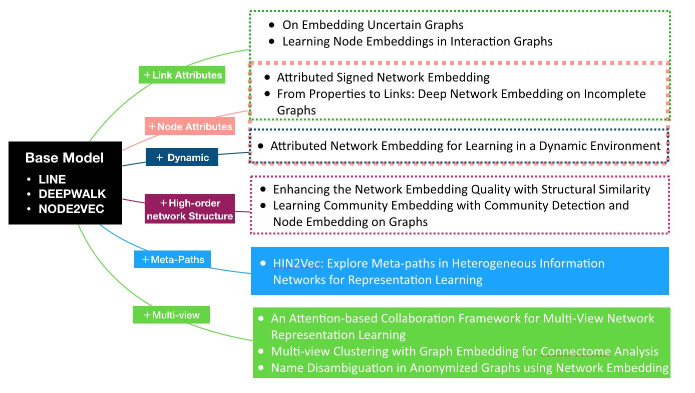 经典的DeepWalk、Node2Vec、LINE算法,主要基于浅层模型,但由于网络结构本身比较复杂,浅层模型往往收敛于局部最优解,无法表示更高级的非线性网络结构。而且,如何融合节点属性、边的权重、边的属性、高阶网络结构做整体Embedding,以及动态网络的增量Embedding/meta-path/Multi-view/Attention等,提高节点分类/link预测的精度,是当前学术研究的核心方向。