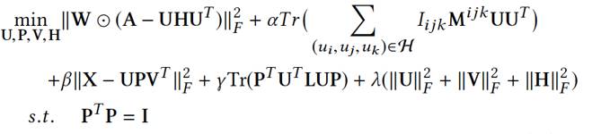 针对上述问题,论文先构建“用户-用户”、“用户-论文”、“论文-论文”组成的异构网络,如下图: