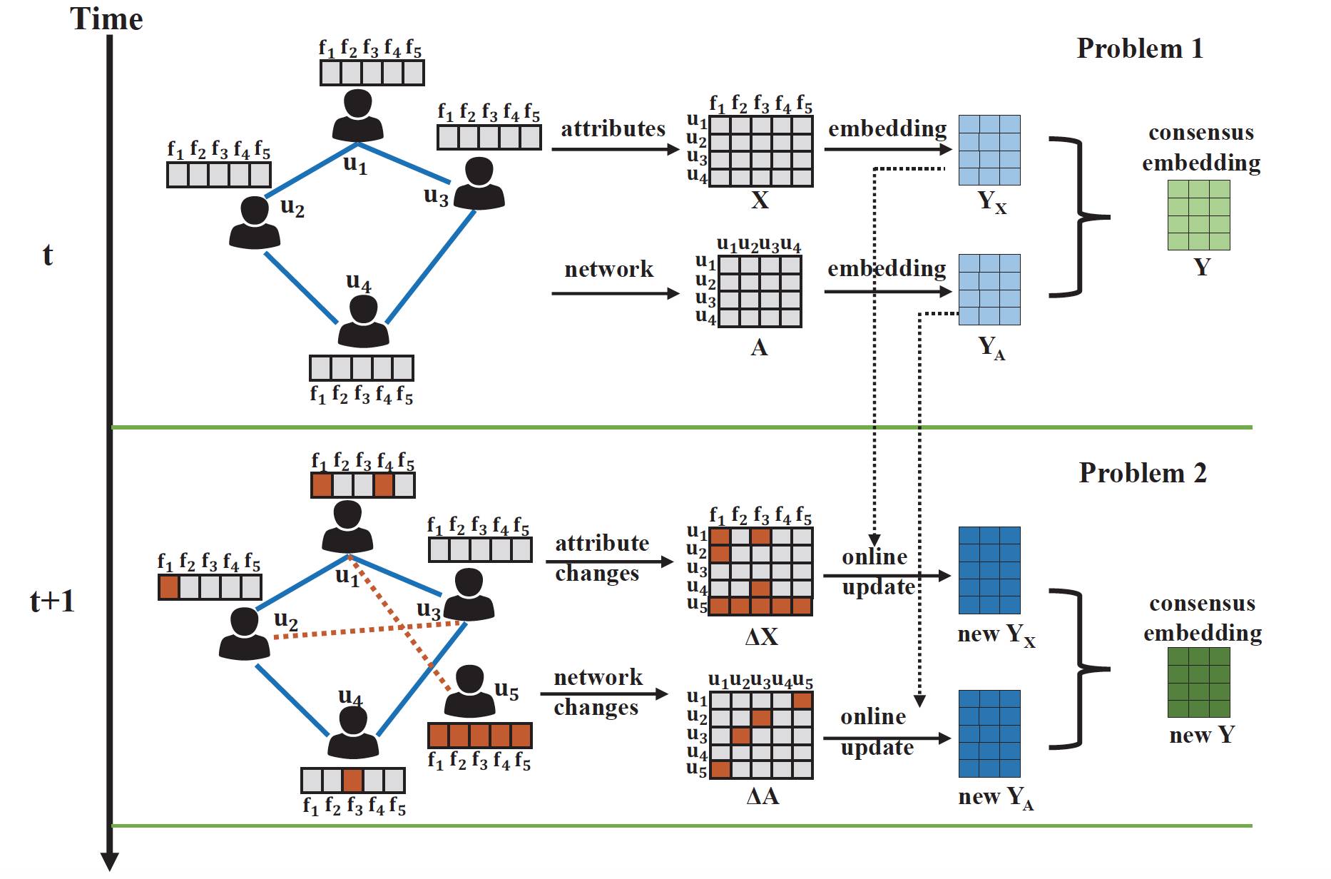 离线模型得到初始consensus embedding(网络结构和节点属性的Embedding最大程度一致)。
