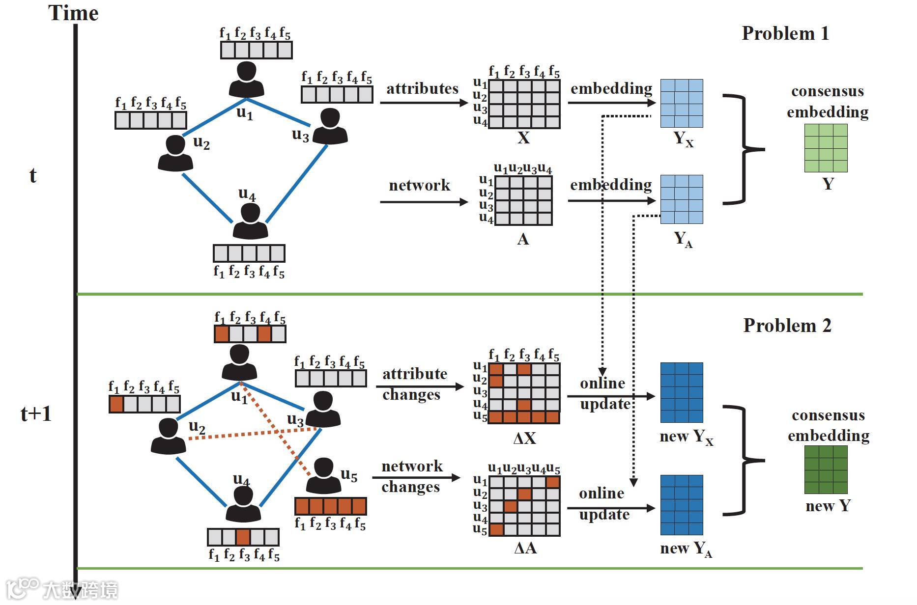 解读:动态网络Embedding,节点属性和网络结构(边)随时间动态变化,如何:A)去除网络关联和节点属性中的noisy and incomplete,得到综合“属性+网络边”的representation;B)embedding需要根据网络动态变化快速更新。论文算法DANE,提出同时融合节点属性和网络结构信息的无监督Embedding算法,且能够快速动态更新,核心2步走: