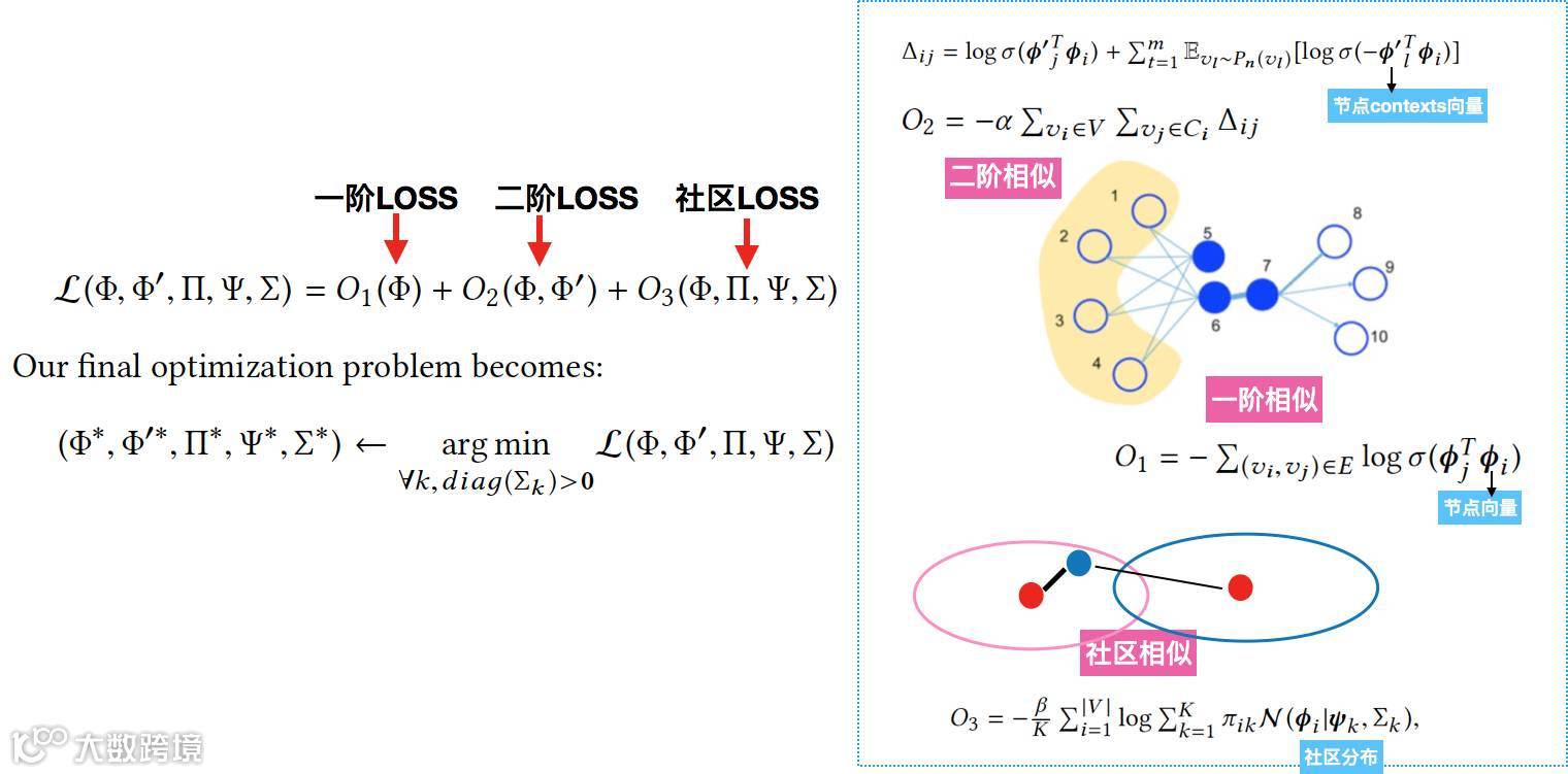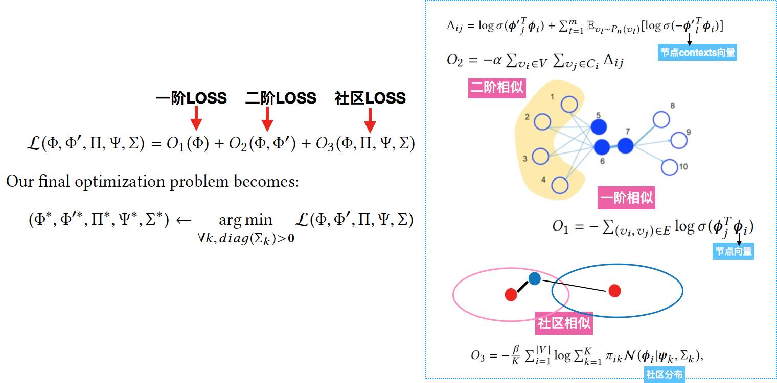 解读:community embedding,网络社区结构的向量表达,通常是其节点集合的向量分布(多元高斯分布)。基本假设:节点embedding,与其所在社区的中心节点相似度高,这个假设约束有助于Node Embedding更好的引入网络高阶信息,进而更好的支持community detection。当前,community embedding, community detection and node embedding这3大任务通常都作为独立的问题去解,本文提出一个闭环算法结构,算法的输出同时包含节点向量、社区向量以及最优社区结构划分。