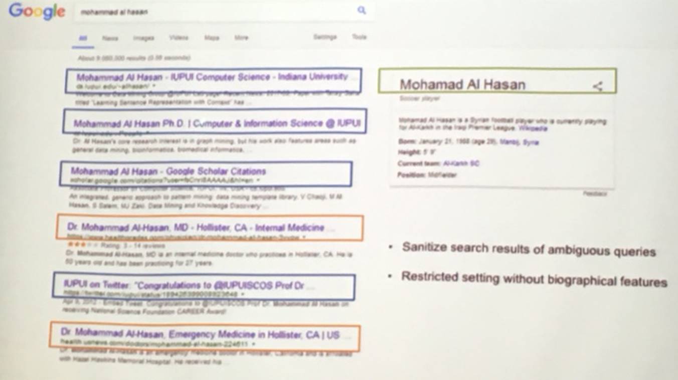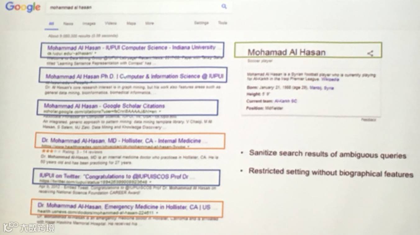 解读:重名的人很多,而独一无二的指纹/DNA信息通常很难获取或因涉及用户隐私不能使用,如何正确区分同名不同人。论文中提出仅依赖关系网embedding的方法,能够将同名不同人的聚类区分。例如:在GOOGLE搜索人名,希望同一自然人的文章能够一起顺序展示,如下图,不同的颜色代表不同的自然人: