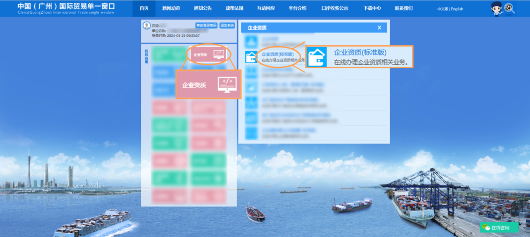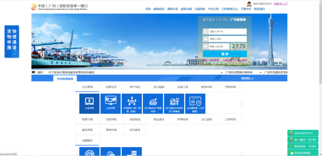 在浏览器输入网址(gz.gd.singlewindow.cn)进入中国(广州)国际贸易单一窗口门户首页,通过广州版登录进入系统。