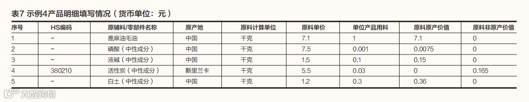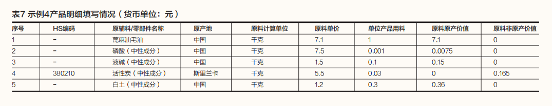 需要注意的是,尽管在生产过程中使用了磷酸、液碱、活性炭和白土,但这些材料仅用于去除蓖麻油中的杂质,并未构成蓖麻油的组成成分,因此上述材料应被视为中性成分。在大部分原产地规则中,中性成分的原产地不影响货物原产地的确定。在填写产品成本明细时,作为中性成分的材料可用括号加注“中性成分”或“不构成产品组成部分”字样。产品成本明细填写情况如表7所示。