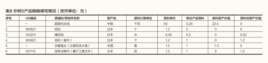 需要注意的是,由于备用纽扣及保养说明书与货物一并归类,为该货物定制的,应视为货物的一部分。在有的优惠原产地规则中,与货物一并归类的附件、备件及工具应视为货物的一部分,只要满足以下条件:该附件、备件及工具和货物一起开具发票;该附件、备件及工具的数量及价值是根据商业习惯为货物正常配备的。在确定货物原产地时,如果货物适用区域价值成分标准,和货物一并归类的附件、备件及工具的价格应当按照各自的原产资格纳入原产材料或者非原产材料的价格予以计算。为了便于根据不同的原产地规则正确确定货物的原产地或原产资格,生产商在填写产品成本明细时,如产品包含附件、备件和工具,需在产品成本明细中如实填写,并作相应标注。产品成本明细填写情况如表8所示。