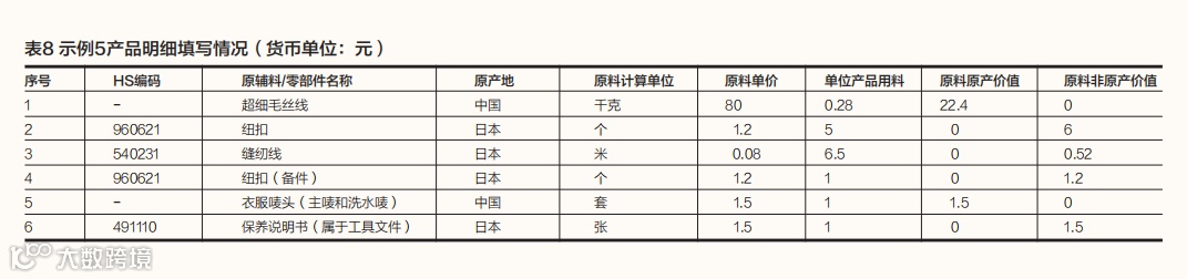 示例5:中国某企业生产细毛制针织女式开襟衫(HS编码611019),FOB价值为85元/件。原材料情况包括:(1)超细毛丝线,中国产,价格为80元/千克,每单位产品用料为0.28千克;(2)纽扣,日本产,价格为1.2元/个,每单位产品用料为6个(含1个备用纽扣);(3)缝纫线,日本产,价格为0.08元/米,每单位产品用料为6.5米;(4)衣服唛头(主唛和洗水唛),中国产,价格为1.5元/套,每单位产品用料为1套;(5)保养说明书,日本产,价格为1.5元/张,每单位产品用料为1张。主要生产加工工序为:将毛丝线织成衣片半成品,缝合衣片,缝唛头。