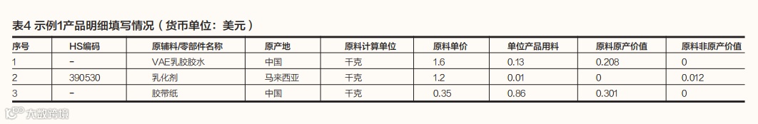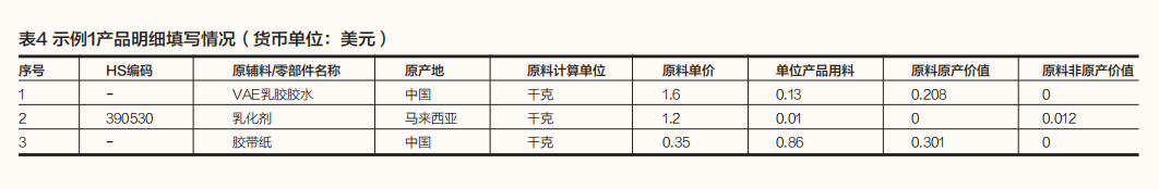 示例1:中国某企业生产自粘PVC膜(HS编码391990),FOB价值为1.17美元/千克。原材料情况包括:(1)VAE乳胶胶水,中国产,价格为1.6美元/千克,每单位产品用料为0.13千克;(2)乳化剂,马来西亚产,价格为1.2美元/千克,每单位产品用料为0.01千克;(3)胶带纸,中国产,价格为0.35美元/千克,每单位产品用料为0.86千克。主要生产加工工序为:将VAE乳胶胶水、乳化剂加热后涂在胶带纸上,待冷却后进行裁切。产品成本明细填写情况如表4所示。