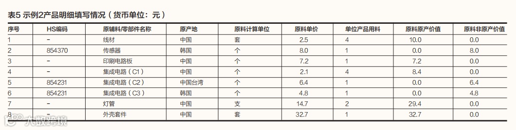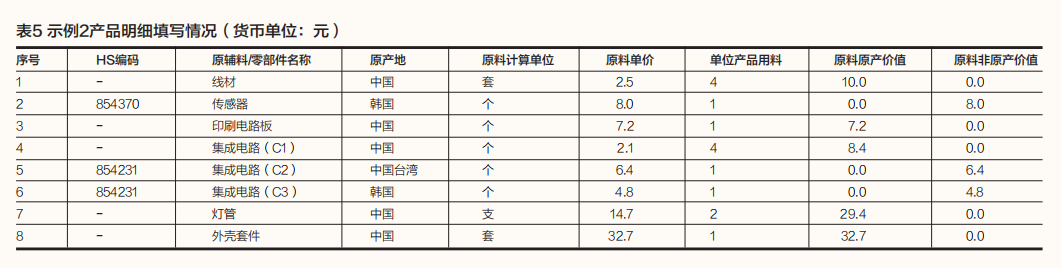 示例2:中国某企业生产紫外线杀菌灯(HS编码853949),FOB价值为135.5元/台。原材料情况包括:(1)线材,中国产,价格为2.5元/套,每单位产品用料为4套;(2)传感器,韩国产,价格为8元/个,每单位产品用料为1个;(3)印刷电路板,中国产,价格为7.2元/个,每单位产品用料为1个;(4)集成电路(C1),中国产,价格为2.1元/个,每单位产品用料为4个;(5)集成电路(C2),中国台湾产,价格为6.4元/个,每单位产品用料为1个;(6)集成电路(C3),韩国产,价格为4.8元/个,每单位产品用料为1个;(7)灯管,中国产,价格为14.7元/支,每单位产品用料为2支;(8)外壳套件,中国产,价格为32.7元/套,每单位产品用料为1套。主要生产加工工序为:将电子元件进行组装,再和灯管一起安装到外壳中。需要注意的是,原材料中包含3种不同原产地的集成电路,需要分项填写,分别注明原产地、计算单位、单价、单位产品用料等信息。产品成本明细填写情况如表5所示。